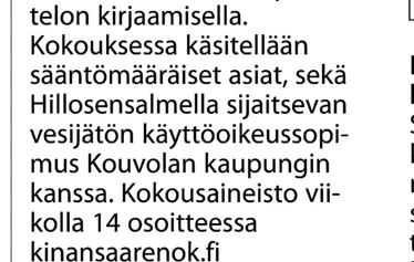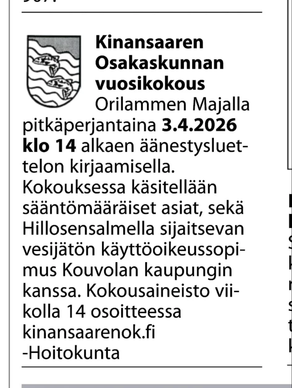Vuosikokouksen ajankohta on pitkäperjantai 3.4.2026 klo 14 alkaen Orilammen Majalla. Kutsu on ollut Kouvolan Sanomissa 18.3.2026.